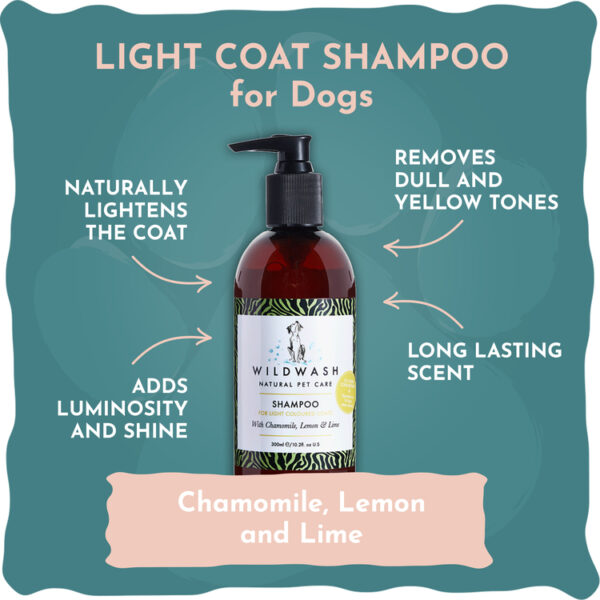 Our WildWash Light Coat Shampoo has been carefully crafted to brighten and revitalise light coats using only natural, skin-loving ingredients. Infused with chamomile, known for its calming and anti-inflammatory properties, and lemon, a natural brightener that helps lift stains and dullness, this shampoo brings out your dog’s natural brilliance without compromising on comfort.